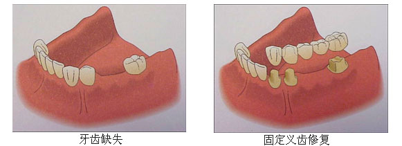 固定义齿包括桩冠和固定桥。利用口中的残根、残冠可进行根管治疗后保留,治疗后的牙根上可进行固定修复恢复牙齿外形,称为桩冠修复。